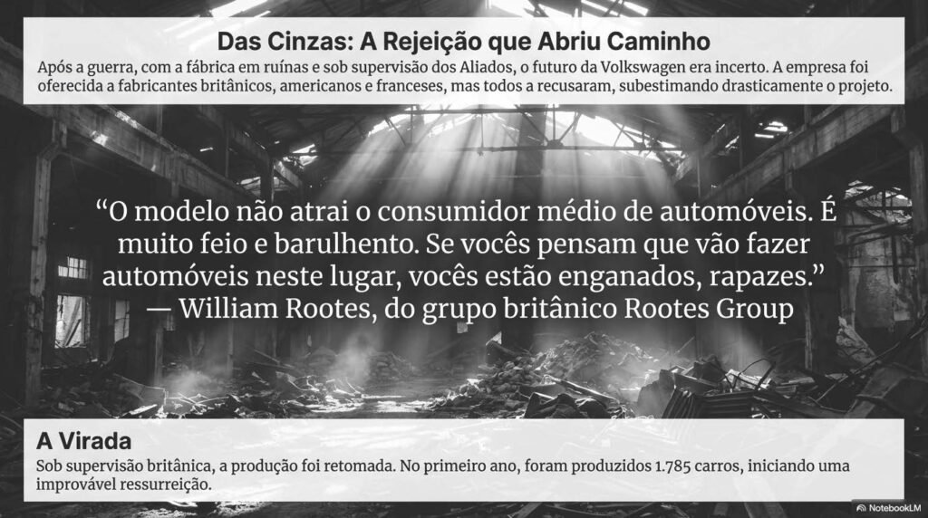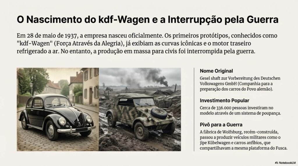 A Segunda Guerra Mundial interrompeu os planos civis do projeto. As fábricas foram direcionadas à produção militar e o sonho do carro popular ficou em suspenso. Mas foi justamente no pós-guerra que o Fusca encontrou seu verdadeiro propósito.
