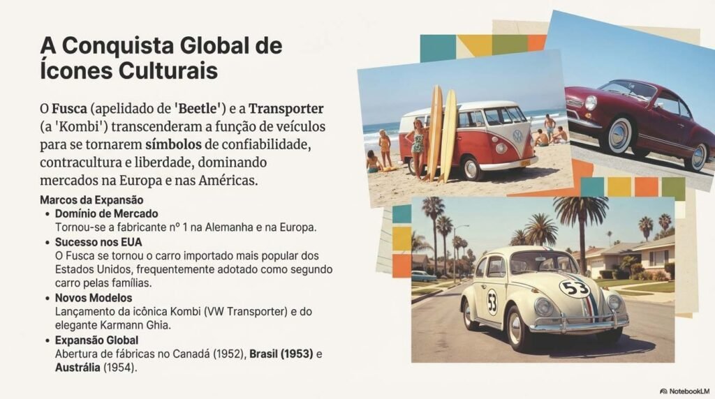 Nas décadas seguintes, o Fusca cruzou oceanos. Tornou-se sucesso nos Estados Unidos, símbolo da contracultura, da liberdade e da simplicidade. Ao mesmo tempo, conquistava mercados na América Latina, África e Ásia.