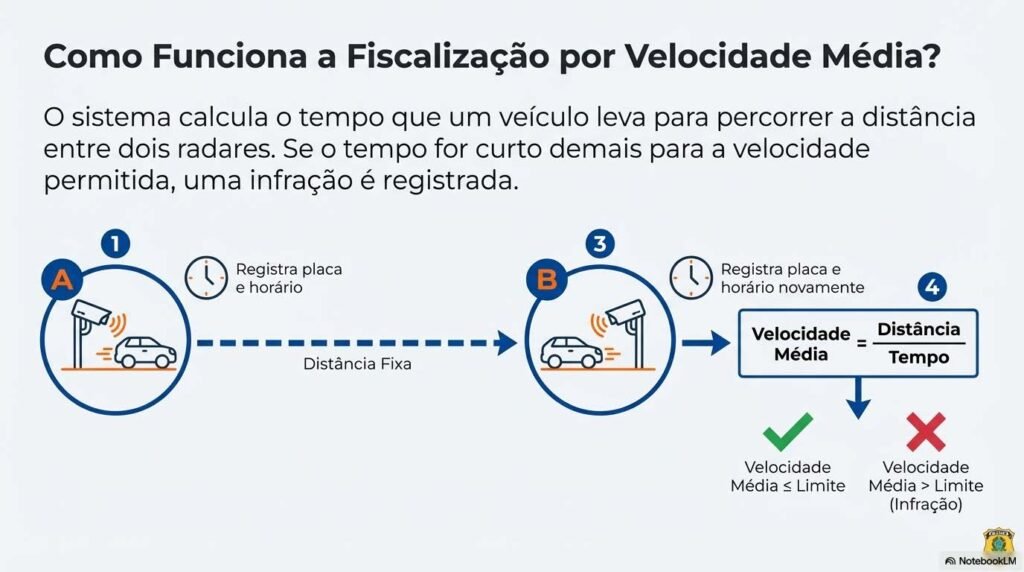 Outro ponto que representa uma verdadeira mudança de paradigma é o sistema de aferição de velocidade média. Em vez de medir a velocidade em um único ponto, o sistema calcula o tempo que o veículo leva para percorrer um trecho entre dois radares. A placa é registrada no primeiro ponto com horário e, no segundo ponto, o registro é feito novamente. Se o tempo gasto for incompatível com o limite permitido para aquele trecho, fica caracterizada a infração por excesso de velocidade média.