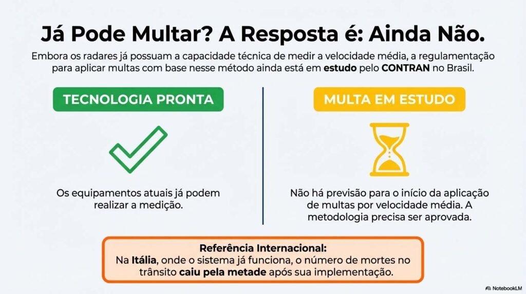 No Brasil, a tecnologia para medição de velocidade média já existe e está instalada em diversos estados, porém a aplicação de multas com base nesse método ainda depende de regulamentação específica do Contran. Em países como a Itália, onde o sistema já é plenamente utilizado, os resultados são expressivos. Após a implementação da fiscalização por velocidade média, o número de mortes no trânsito foi reduzido pela metade.